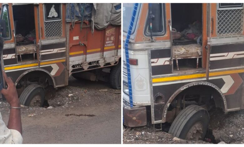 सुमारास ट्रकचे चाक अडकल्यामुळे मोठी दुर्घटना टळली.रस्त्यावर पडलेला